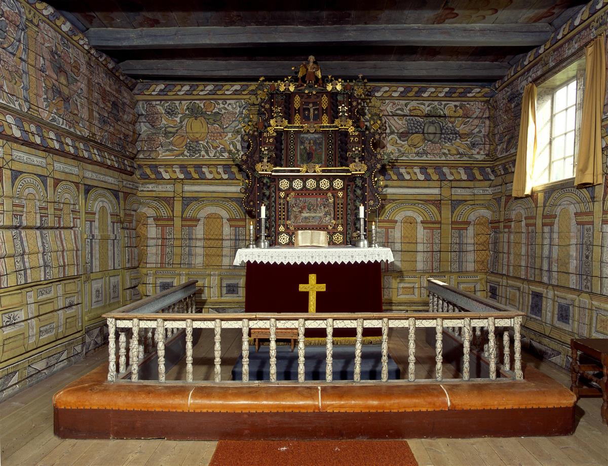 Den rikt dekorerte altertavlen i Rollag stavkirke fra 1670-tallet har et relieff av Maria med Jesusbarnet fra slutten av 1400-tallet.