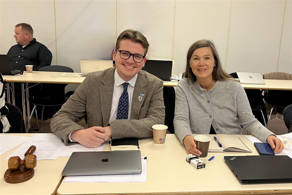 Leder i hovedutvalg for opplæring, Simen Murud (H) og fylkesdirektør Pia Elverhøi.