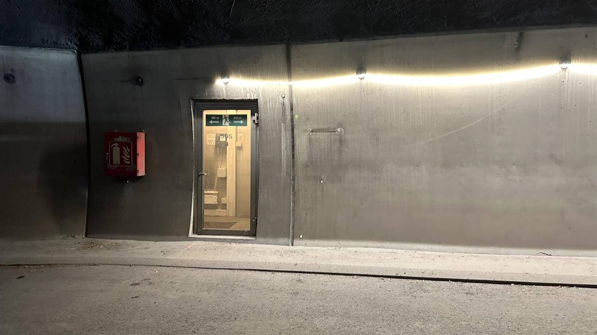 Her ser du døren inn til et nødrom. Inne i nødrommet finner du en telefon. Bruk denne, så vet Vegtrafikksentralen akkurat hvor du befinner deg, og kan skaffe hjelp.