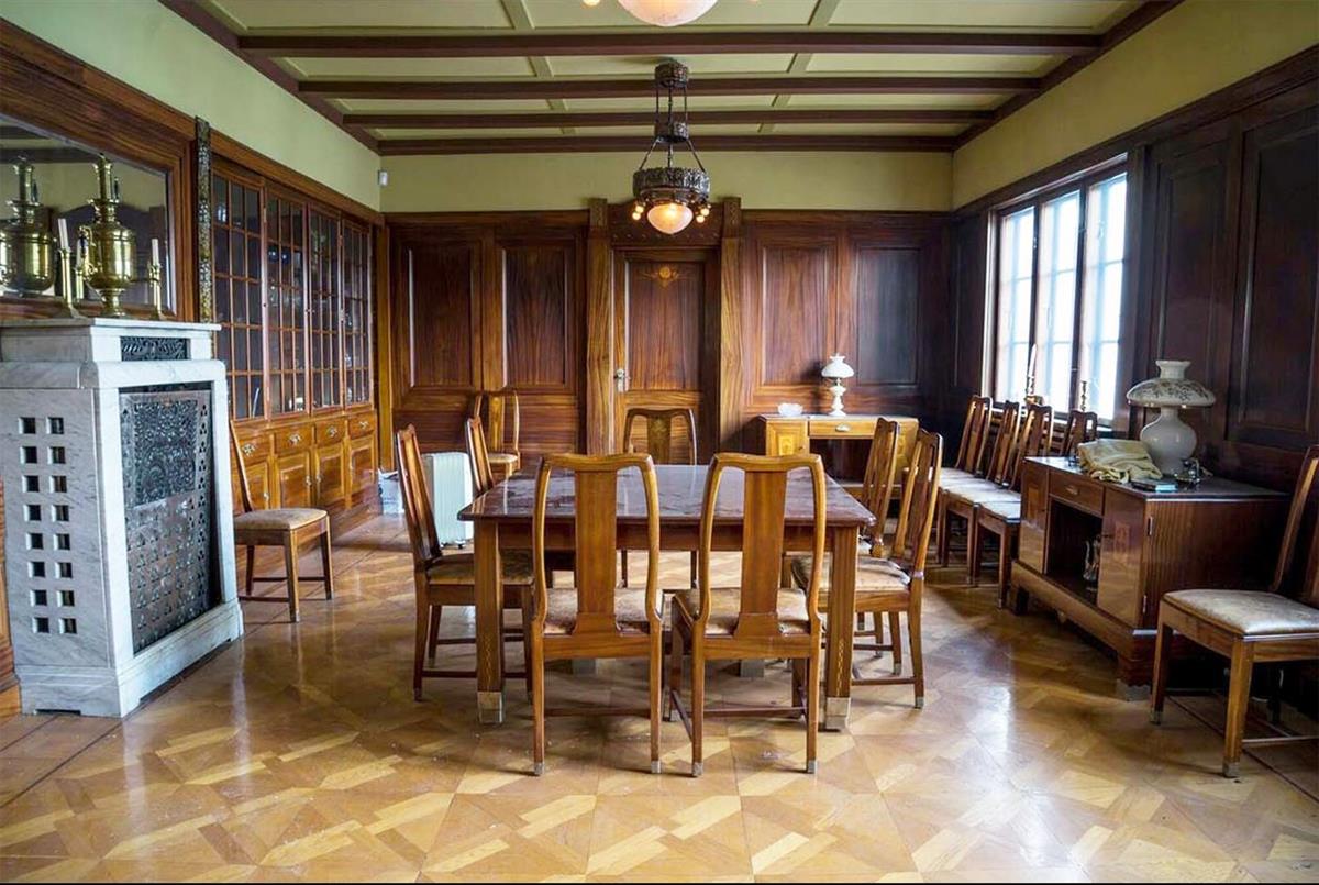 I spisestuen er fast interiør og møbler tegnet av Henrik Bull. Under er gjengitt et av flere blyglassvinduer.