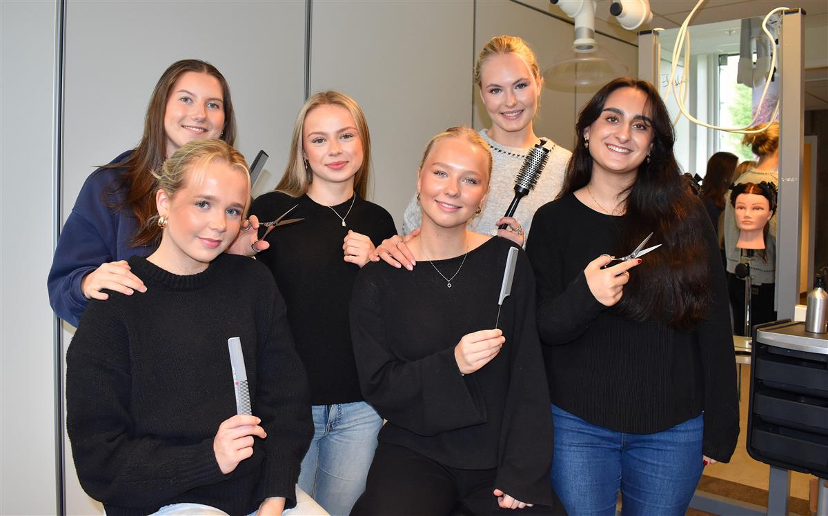 Frisørelever på vg2 gleder seg til å ta i mot kunder i salongen. Stående fra venstre: Julia Maria Værnes, Elise Victoria Streitlien, Nora Skaar Kastås og Lane Dara. Sittende fra venstre: Sofie Lagesen, Frida Feline Gustafsson-Jeg er litt nervøs og både gruer og gleder med. Det er både mer spennende og faktisk lettere å jobbe med ekte hår enn håret på dukkene vi øver på. Vi oppfordrer kunder som har tid på dagtid til å komme, sier Lane Dara. Hun er en av elevene som vil holde frisørsalongen i bygg A åpen for kunder på mandager. Parallellklassen har tilsvarende tilbud på fredager.