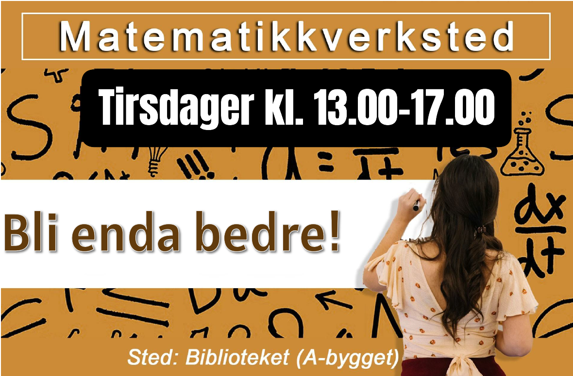 Matematikkverksted tirsdager 13.00-17.00Åpent for alle elever som vil jobbe ekstra med matematikk, få veiledning til skoleoppgaver eller forberede seg til prøver! Oppmøtested på biblioteket i bygg A, tirsdager kl. 13.00-17.00Matematikkverkstedet er åpent for alle elever på Åssiden vgs. fra kl. 13.00-17.00 på skolebiblioteket Publisert av Mats Erik Olsen Publisert 11.11.2025 09.07 Sist endret 11.11.2025 09.07