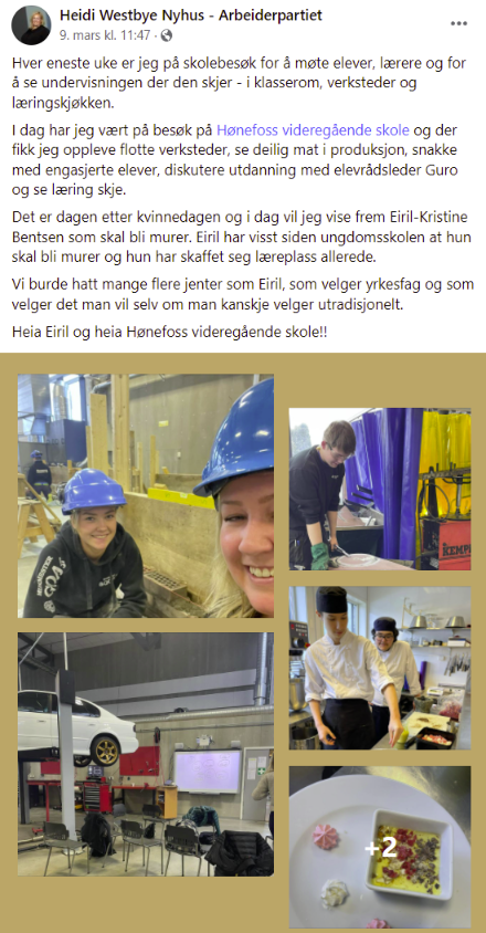 Hun fikk litt innblikk i hva vi driver med gjennom samtaler med lærere, ledere og elevrådsleder. Hun blei også vist rundt på skolen og rakk innom Betongfag, Industriteknologi, Påbygg og Restaurant- og matfag. Hun hadde gode samtaler både med elever og ansatte, og la sjøl ut denne facebook-posten etter besøket: