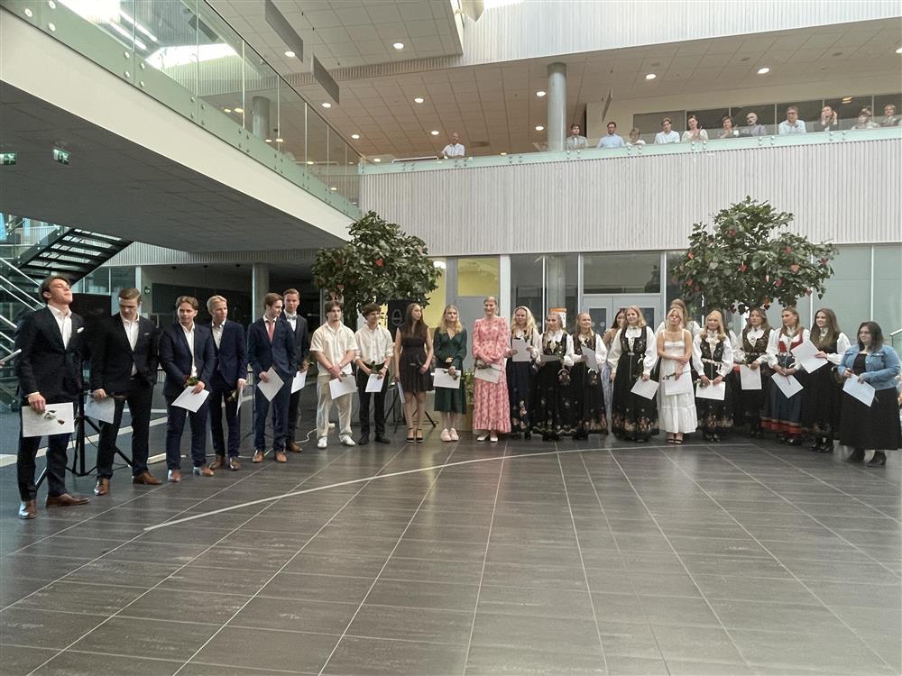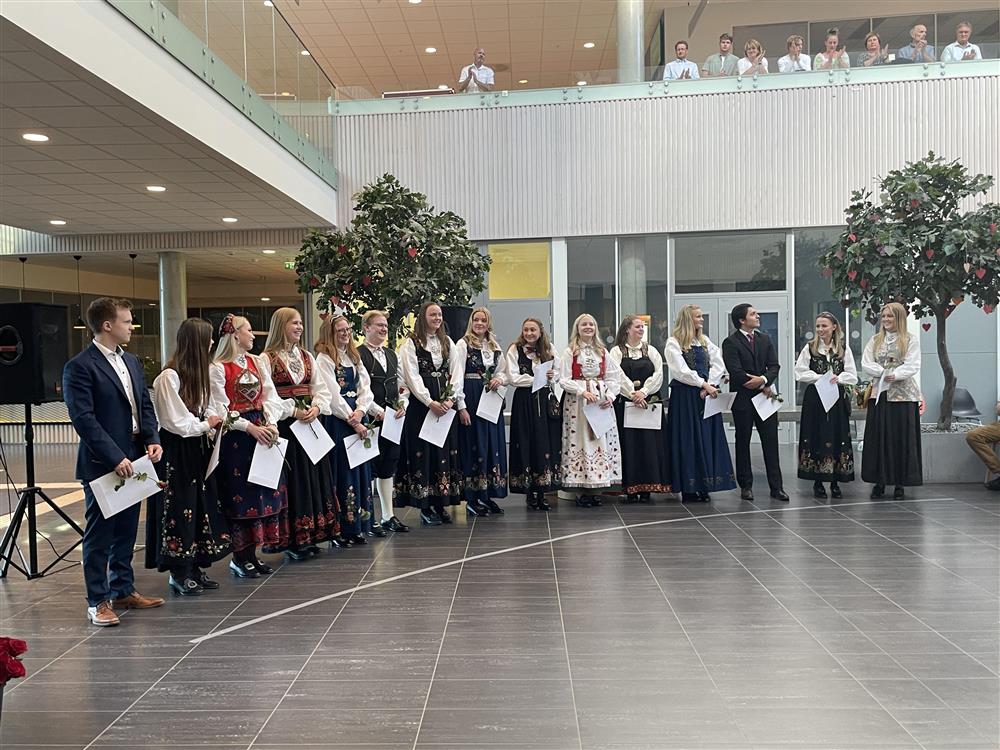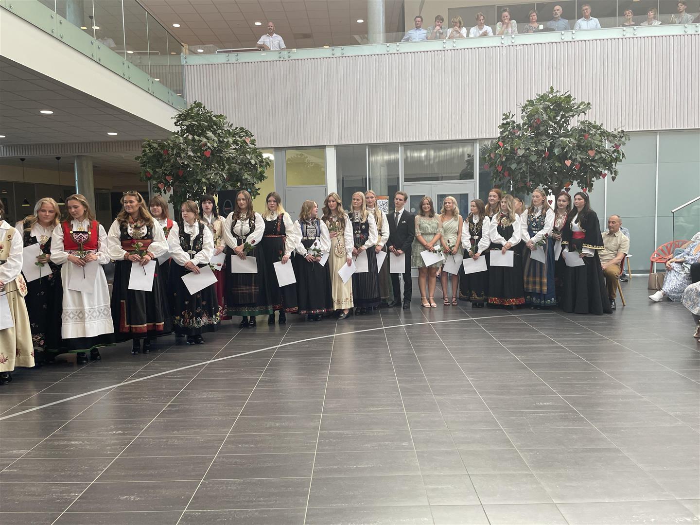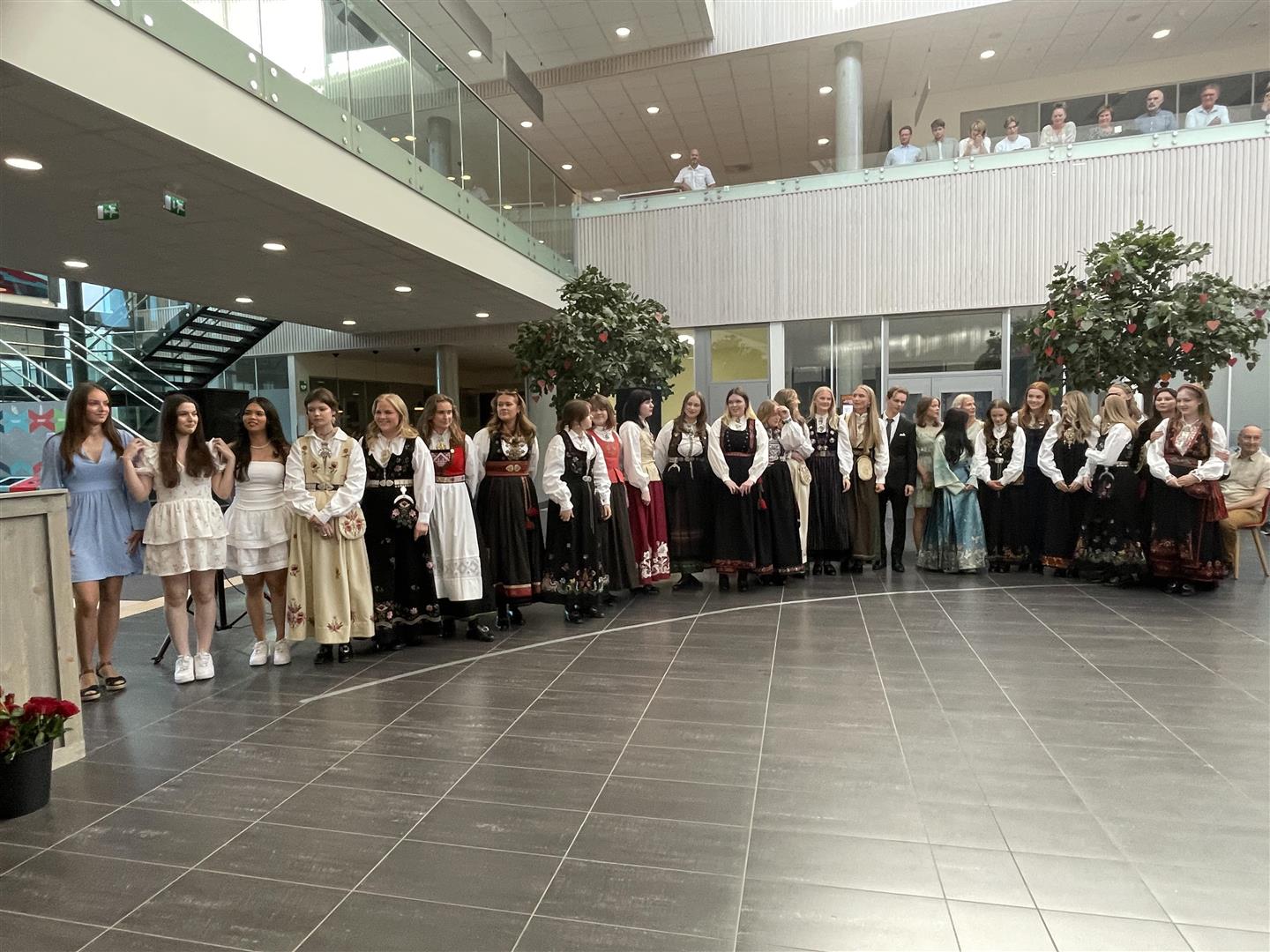 i skolens lokaler som for anledningen var blomsterpyntet av elevene på Vg1 FBIE (Frisør, blomst, interiør og eksponeringsdesign)