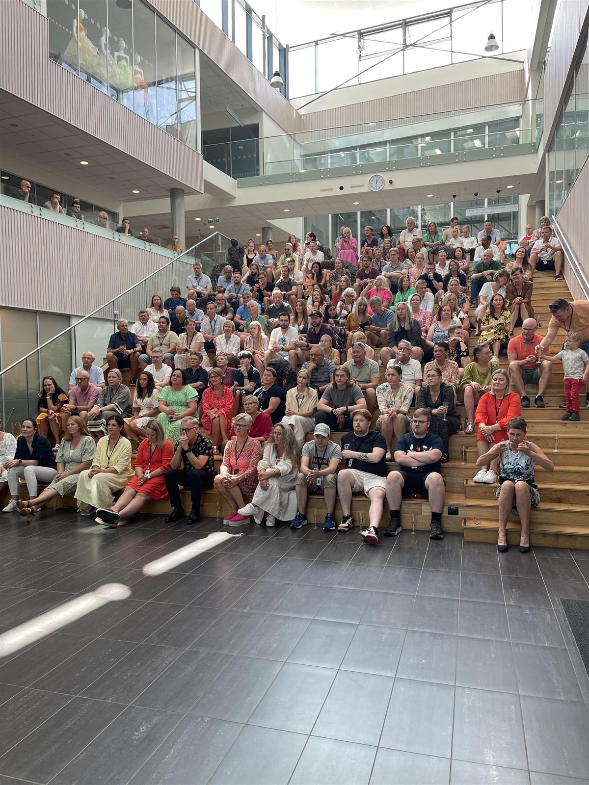 Hønefoss videregående skole hadde sin tradisjonelle sommeravslutning med samling i skolens trapp og lunsj i skolens kantine.