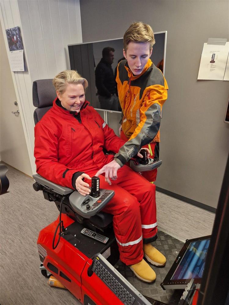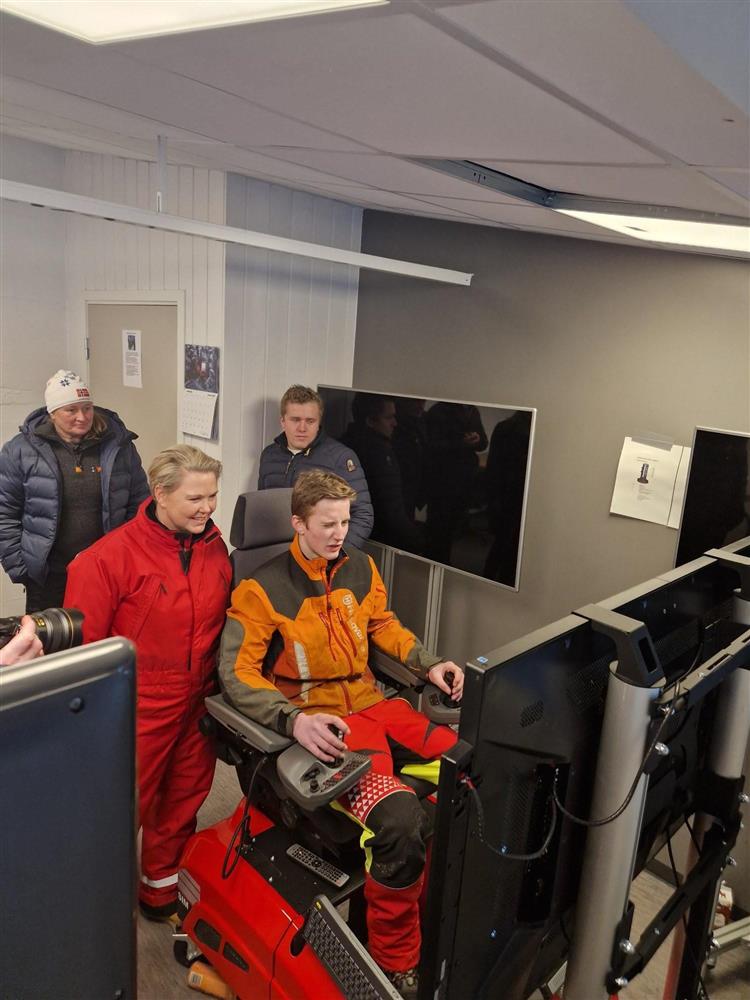 På bildet instruerer Sebjørn Kjøntvedt ministeren på hogstmaskinsimulator. Ministeren var imponert over arbeidet som blir gjort og takket for ett hyggelig besøk.