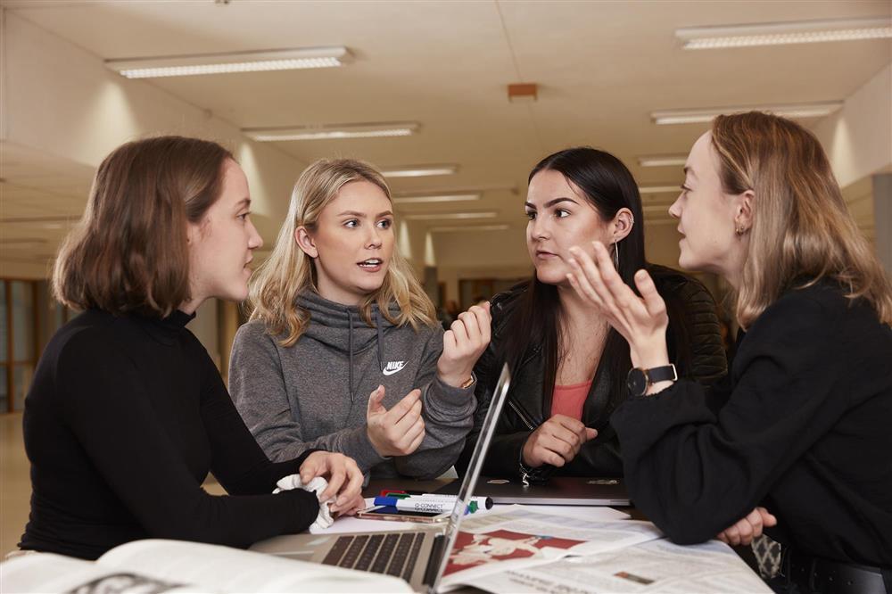Fire jenter sitter rundt et bord og diskuterer - Klikk for stort bilde
