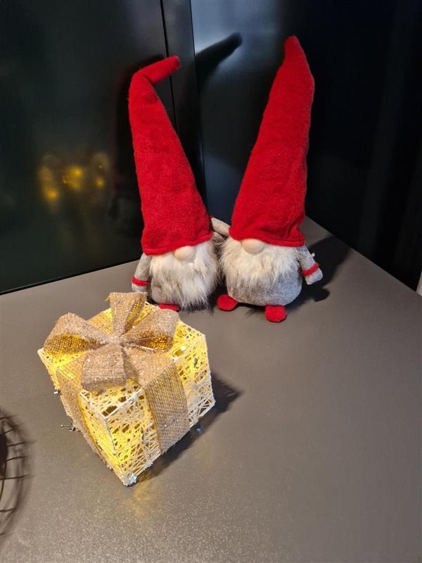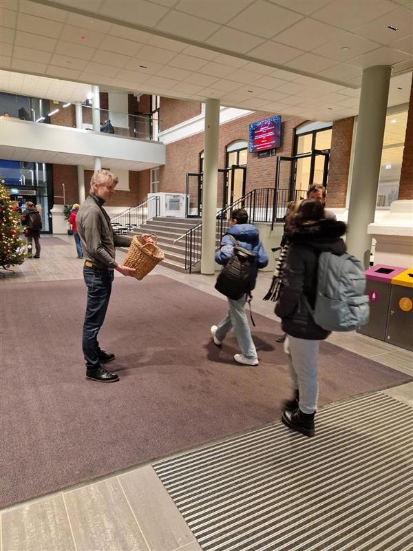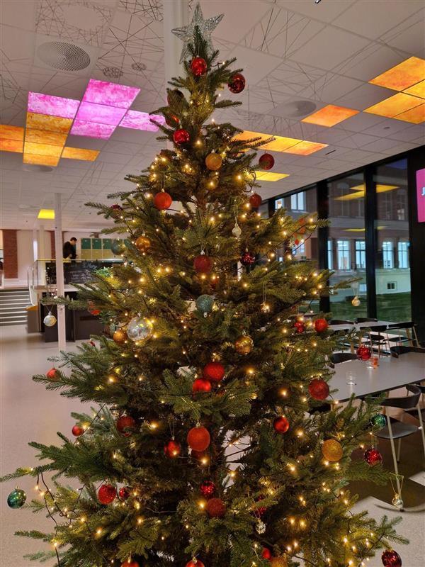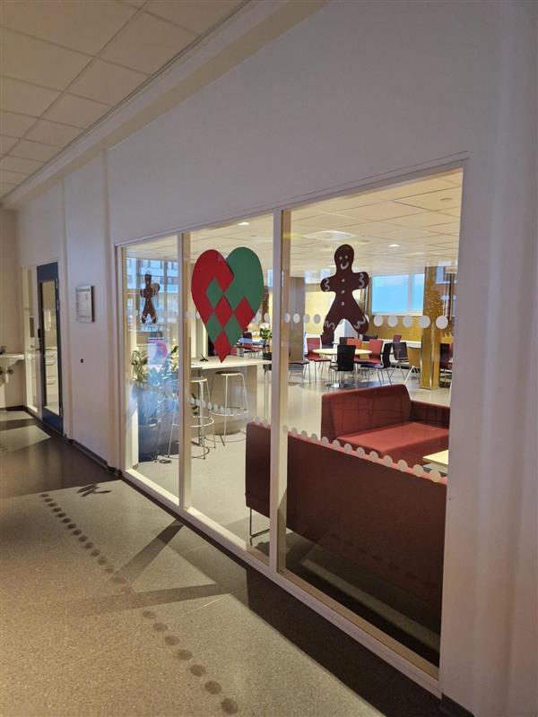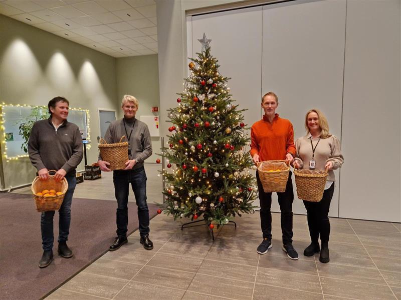 Flere ansatte fra ledelsen stod klare mandag morgen med en hyggelig velkomst. De som ønsket kunne få med seg klementin. Vi har allerede pyntet mye til jul så her har vi julestemning allerede. Ved inngangspartiet og i kantina har vi store juletrær, i tillegg er det pyntet med nisser og annen julepynt både i kantina og på biblioteket.
