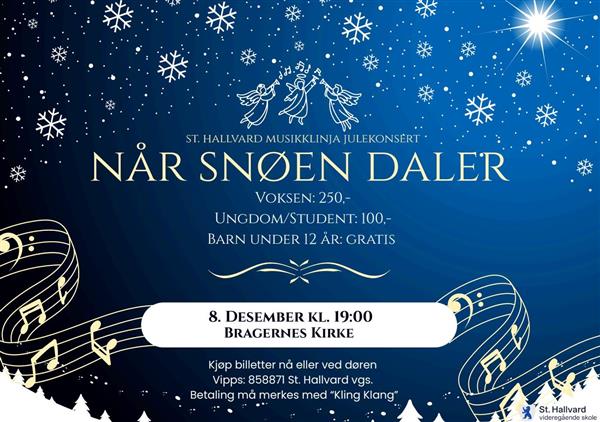 Musikklinja ved St. Hallvard videregående skole har gleden av å holde den årlige julekonsert i Bragernes kirke, 8. desember! Med et vakkert repertoar synges julen inn - “Når snøen daler”