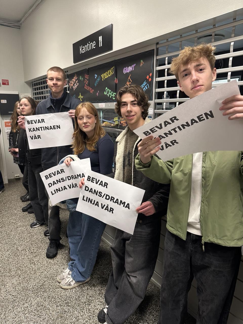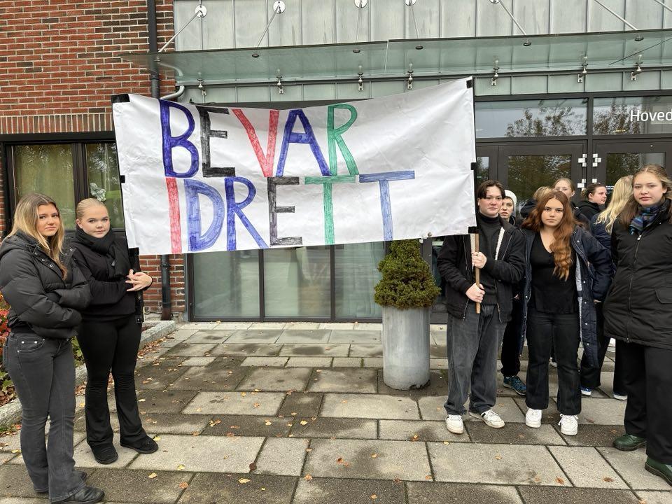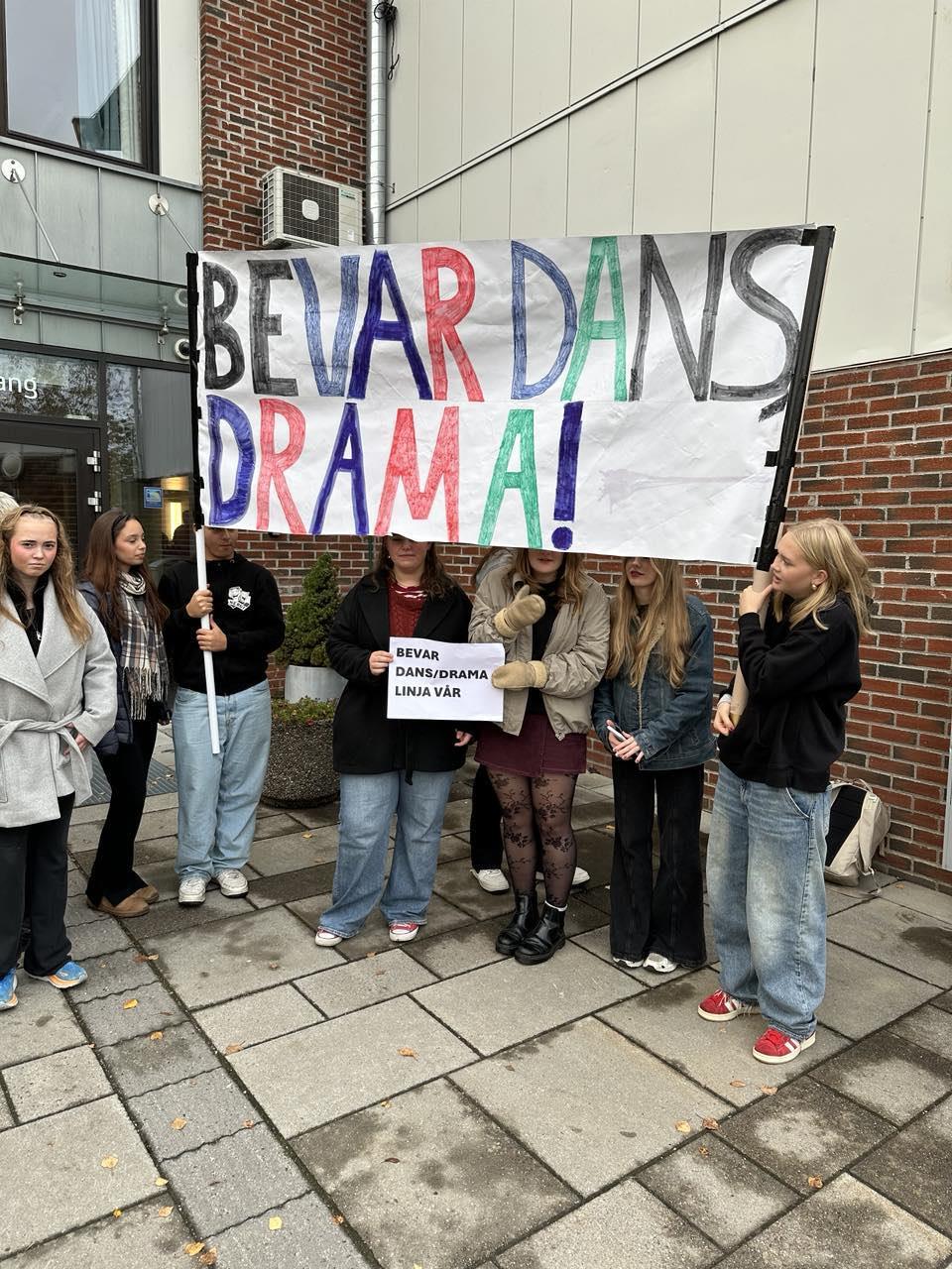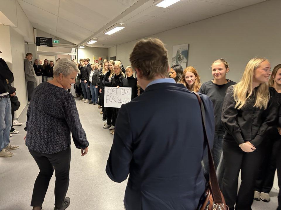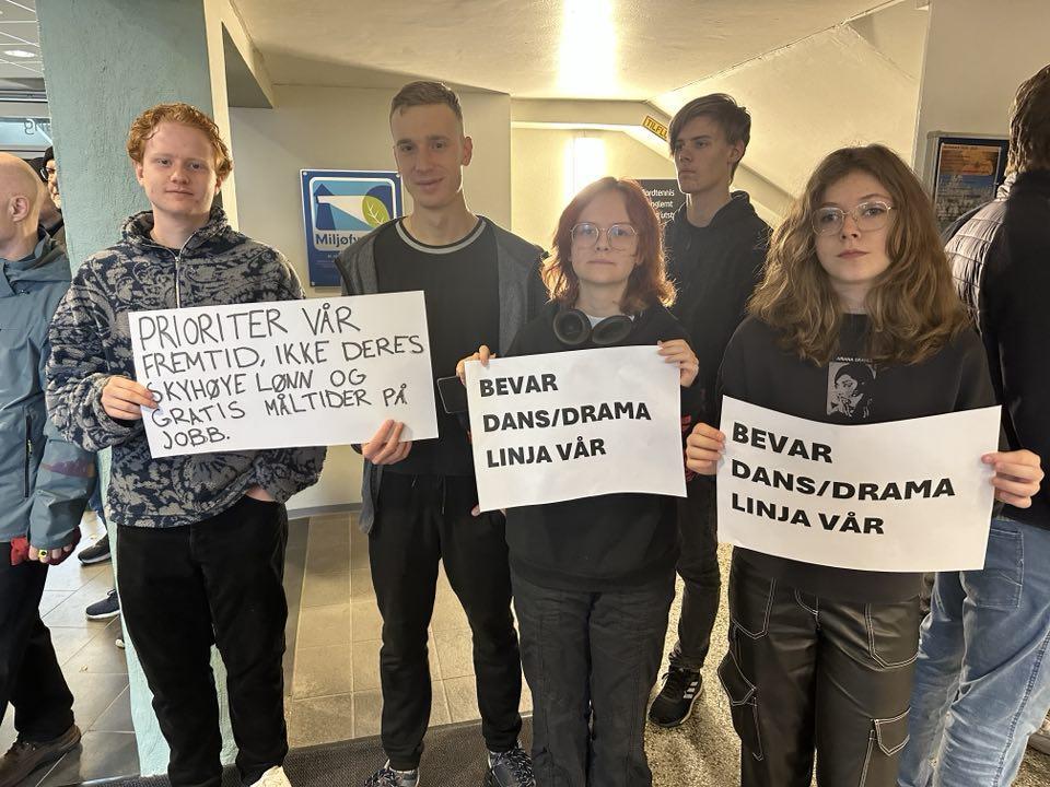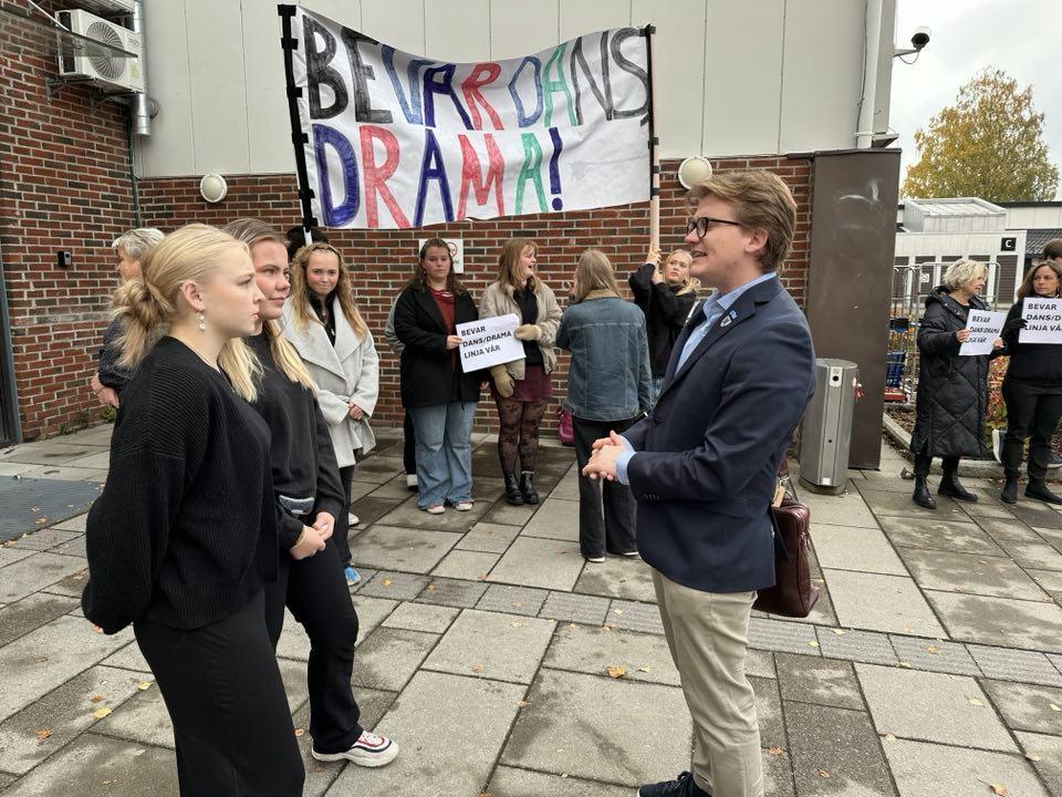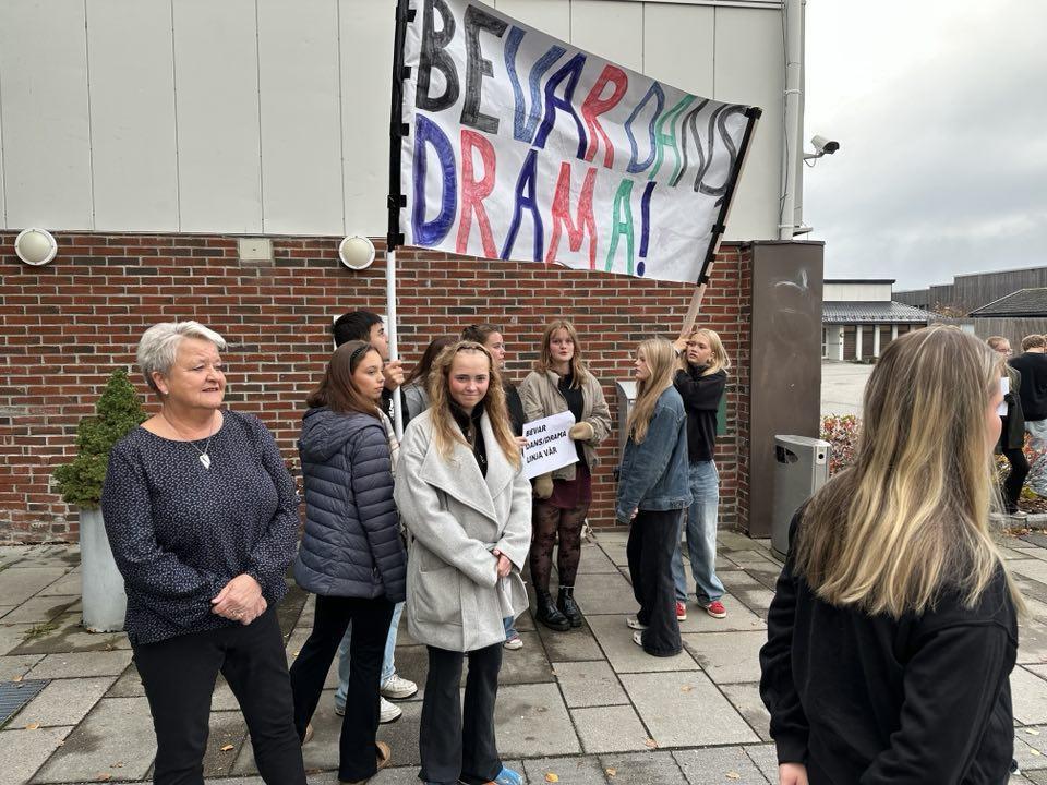 Demonstrasjon mot nedleggelse: Bevar dans, drama- og idrettslinjene! Bevar kantina!Elevrådet var raske med å ordne en demonstrasjon da det ble kjent at leder for Hovedutvalget for utdanning og kompetanse Simen Murud, skulle komme for å møte rektor.Denne artikkelen er over 1 år gammel og kan inneholde utdatert informasjon. Til høyre på bildet: Leder for Hovedutvalget for utdanning og kompetanse Simen Murud (H) møtte demonstranter da han ankom skolen i dag. Til venstre på bildet: Elevrådsleder Ingelin Trelease Eidheim og nestleder Sofie Bing.Elever stilte i sorte klær og med plakater i en stille demonstrasjon. De sto utenfor hovedbygget, i gangen nede og tett i tett opp trappene og hele veien bort til rektors kontor. Ved kontoret møtte Murud elever som overleverte underskrifter fra kampanje. Murud var forberedt på demonstrasjonene og møtte dem med positiv innstilling.– Det er fint at elevene engasjerer seg. Jeg har gledet meg til å møte et slikt engasjement, for jeg mener generelt at folk engasjerer seg for lite. Dette er demokrati i praksis, sa Murud til Drammens Tidende.Elevrådsleder og -nestleder var godt fornlyd med demonstrasjonen og at såpass mange møtte opp på kort varsel! Bra jobba!Les artikkel i dt.no (krever abonnement)Se flere bilder:Rektor Kaia Erlandsen til venstre på bildetHer følger rektor Kaia Erlandsen, Simen Murud til sitt kontor Her mottar Simen Murud underskriftskampanjen. Publisert av Siri Austad Publisert 14.10.2024 14.19 Sist endret 15.10.2024 10.42