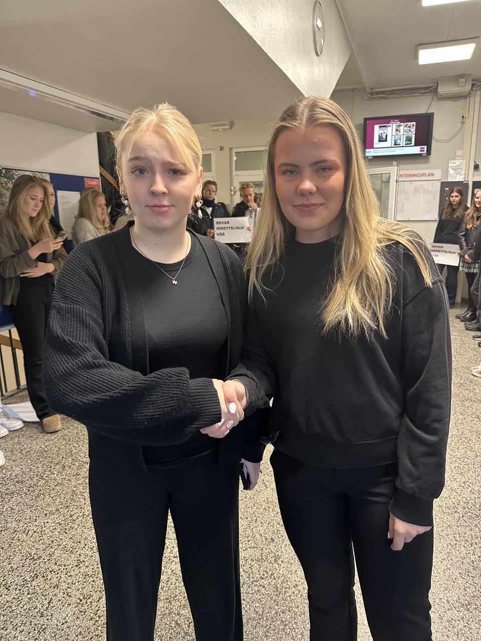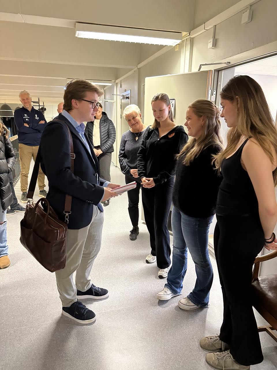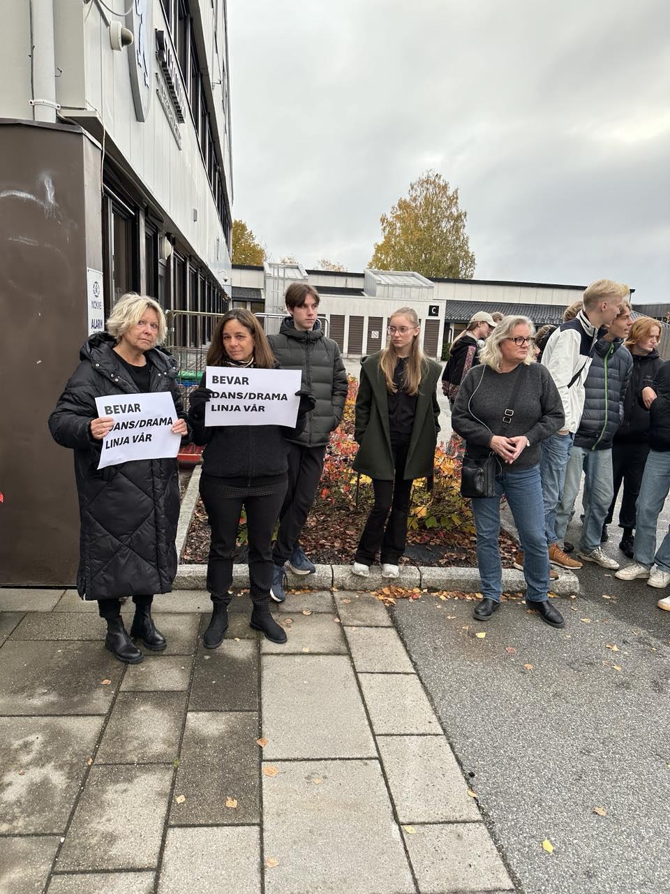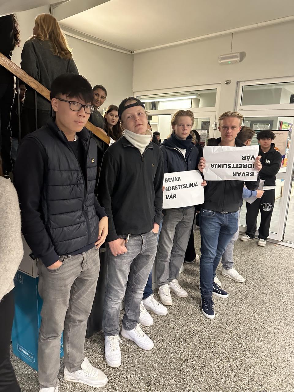 Demonstrasjon mot nedleggelse: Bevar dans, drama- og idrettslinjene! Bevar kantina!Elevrådet var raske med å ordne en demonstrasjon da det ble kjent at leder for Hovedutvalget for utdanning og kompetanse Simen Murud, skulle komme for å møte rektor.Denne artikkelen er over 1 år gammel og kan inneholde utdatert informasjon. Til høyre på bildet: Leder for Hovedutvalget for utdanning og kompetanse Simen Murud (H) møtte demonstranter da han ankom skolen i dag. Til venstre på bildet: Elevrådsleder Ingelin Trelease Eidheim og nestleder Sofie Bing.Elever stilte i sorte klær og med plakater i en stille demonstrasjon. De sto utenfor hovedbygget, i gangen nede og tett i tett opp trappene og hele veien bort til rektors kontor. Ved kontoret møtte Murud elever som overleverte underskrifter fra kampanje. Murud var forberedt på demonstrasjonene og møtte dem med positiv innstilling.– Det er fint at elevene engasjerer seg. Jeg har gledet meg til å møte et slikt engasjement, for jeg mener generelt at folk engasjerer seg for lite. Dette er demokrati i praksis, sa Murud til Drammens Tidende.Elevrådsleder og -nestleder var godt fornlyd med demonstrasjonen og at såpass mange møtte opp på kort varsel! Bra jobba!Les artikkel i dt.no (krever abonnement)Se flere bilder:Rektor Kaia Erlandsen til venstre på bildetHer følger rektor Kaia Erlandsen, Simen Murud til sitt kontor Her mottar Simen Murud underskriftskampanjen. Publisert av Siri Austad Publisert 14.10.2024 14.19 Sist endret 15.10.2024 10.42
