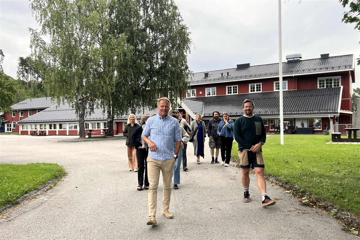 Rektor Morten Eikenes - Klikk for stort bildeRingerike folkehøgskole ligger idyllisk til. Her får noen av gjestene omvisning av rektor Morten Eikenes. Johanne Reiersrud / Buskerud fylkeskommune