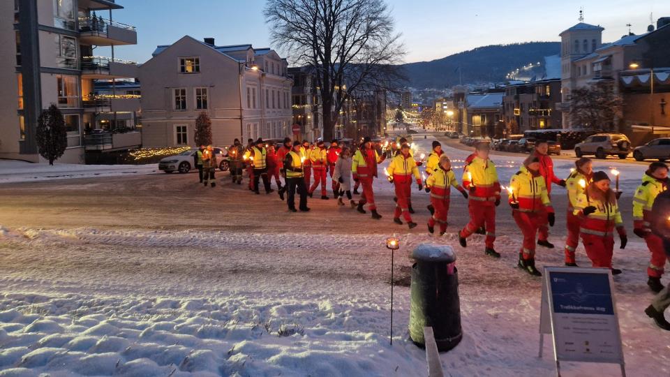 Trafikkofrenes dag 2026: Fakler for de fem som aldri kom hjem Søndag ettermiddag ble Trafikkofrenes dag markert med fakkeltog og minnemarkering i Bragernes kirke.