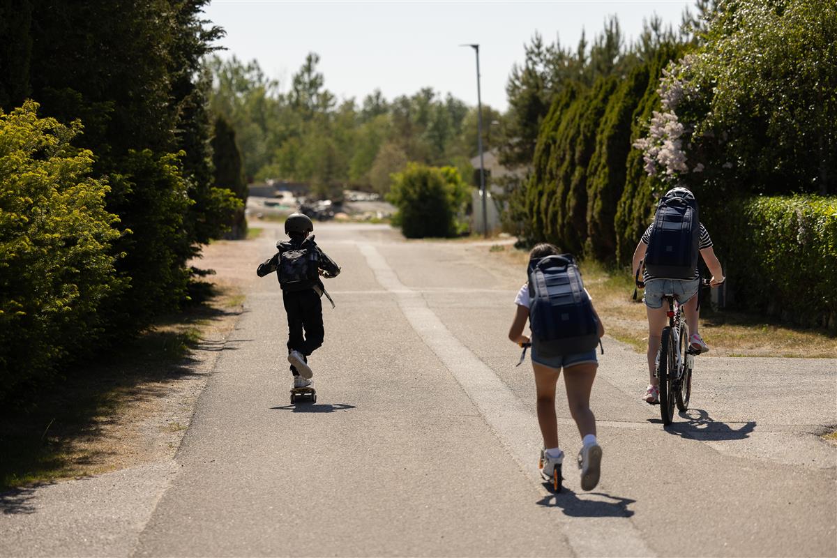 tre barn på sykkel og sparkesykkel  - Klikk for stort bildeIllustrasjonsbilde Morten Brakestad