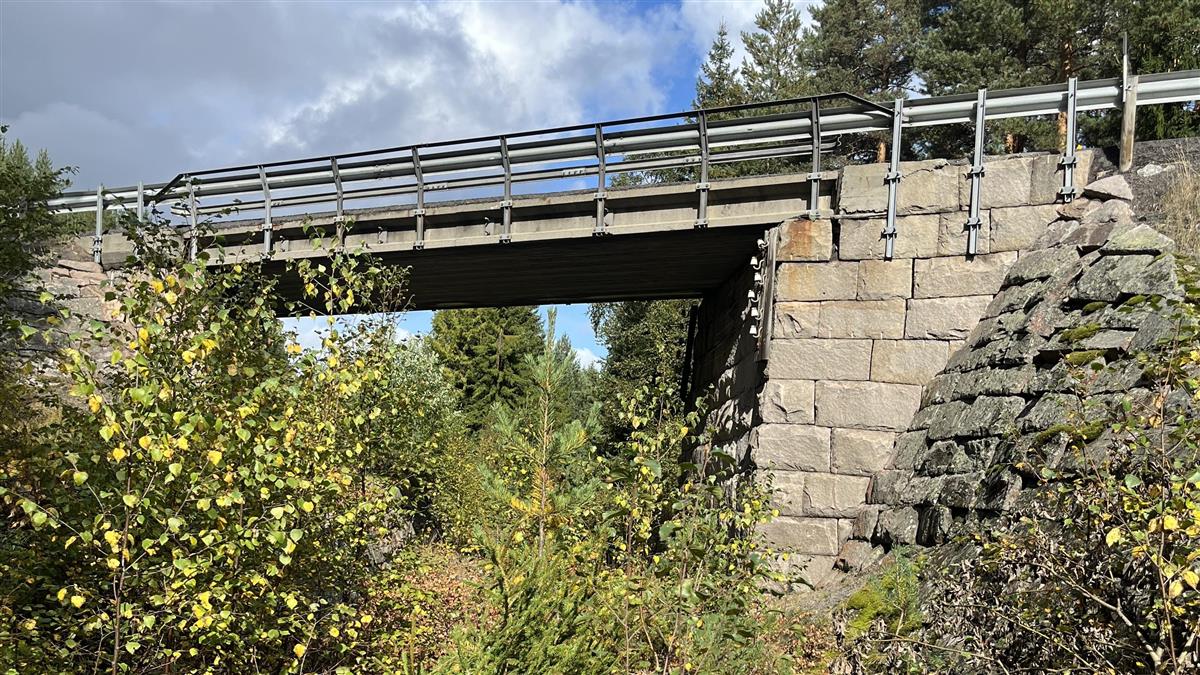 En bru med en del vegetasjon under - Klikk for stort bildeAslefet bru går over den nedlagte Numedalsbanen Ingerid Sinding-Larsen / Buskerud fylkeskommune